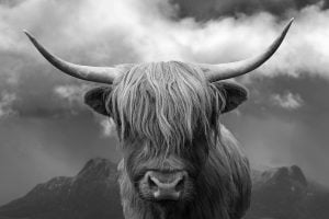A black and white image of a highland Cow with Ben loyal mountain range in the background.