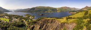 An aerial view panorama image from Ballachulish quarry looking over to Loch Leven and the pap of Glencoe