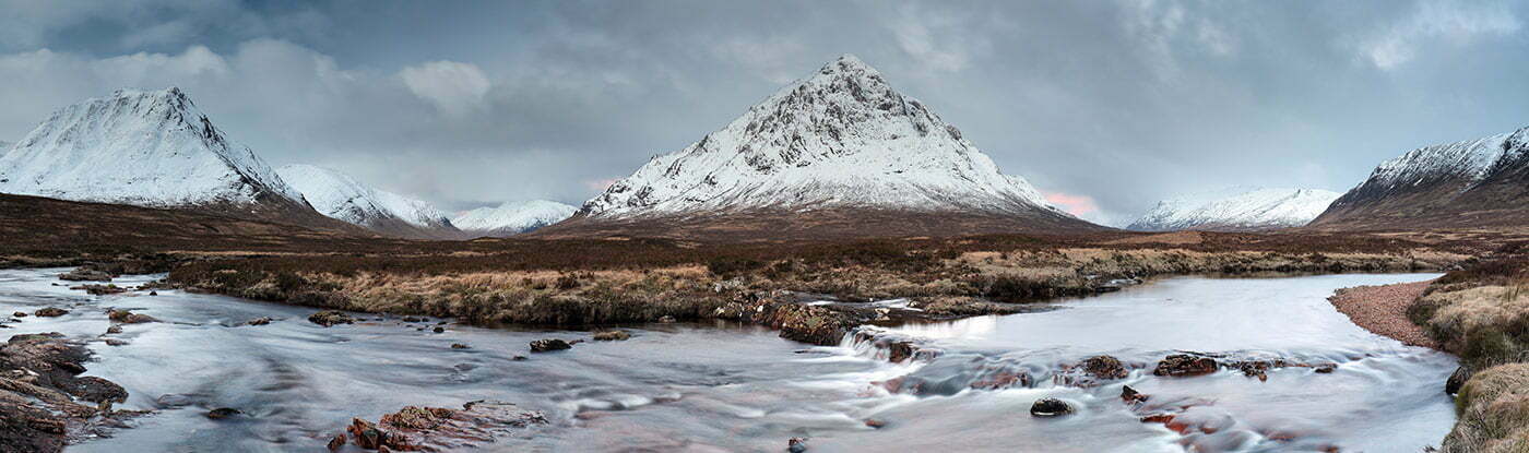 A panoramic image of the mountain Creise and Buachaille Etive Mor during Sunrise at Glencoe.