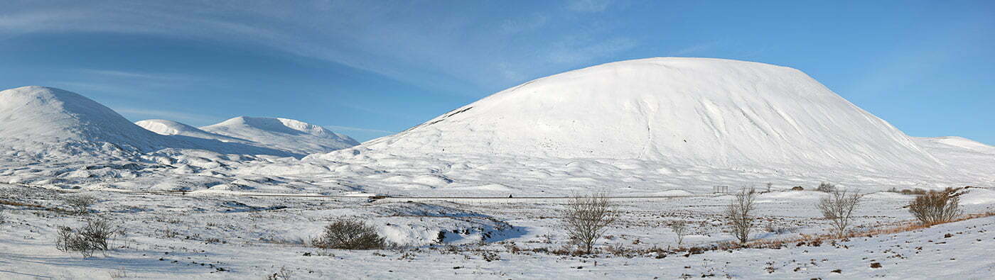 A panoramic image of the snow covered pass of Drumochter in the Scottish highlands