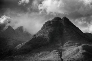 A black and white photograph of the mountain Sgurr Na Stri and ominous weather approaching over the Cuillin ridges. Taken from Elgol on the Isle of Skye.