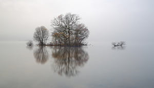 Lone trees shedding the last of their autumn leaves reflecting on the mist covered water of Loch Lomond