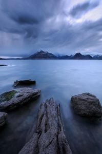 A long exposure after Sunset from the rocky shore of Elgol on the Isle of Skye, Scotland.