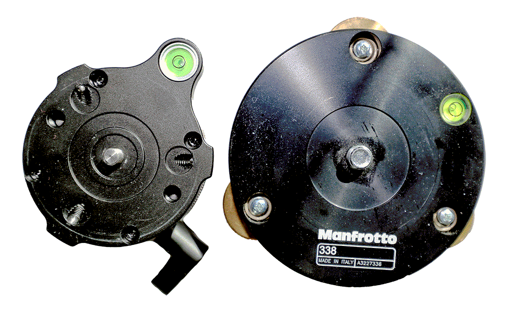 Attached to the Manfrotto 410 geared head and 300n rotation unit above left is the Manfrotto 338 levelling base. Far right image is the Sunwayfoto DYH-66i levelling base.