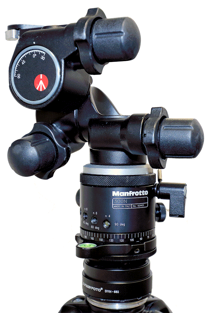 Unlike the Manfrotto 338, the Sunwayfoto DYH-66i can be unlocked and swiveled (though not independently) to a convenient viewing angle for leveling with the offset bubble level, regardless of the position of the tripod. After that, I can simply rotate the 300n or 410 geared head, which can rotate independently of other attached equipment, if needed.